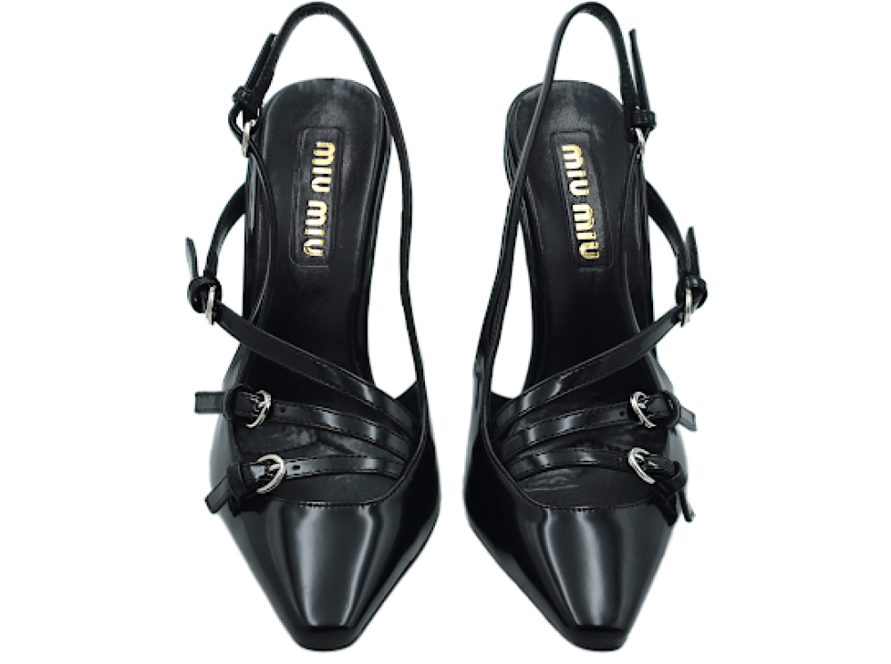 • كعب أسود فخم تصميم أنثوي أنيق يعكس روح دار ميو ميو الجريئة والمفعمة بالتفاصيل الراقية.