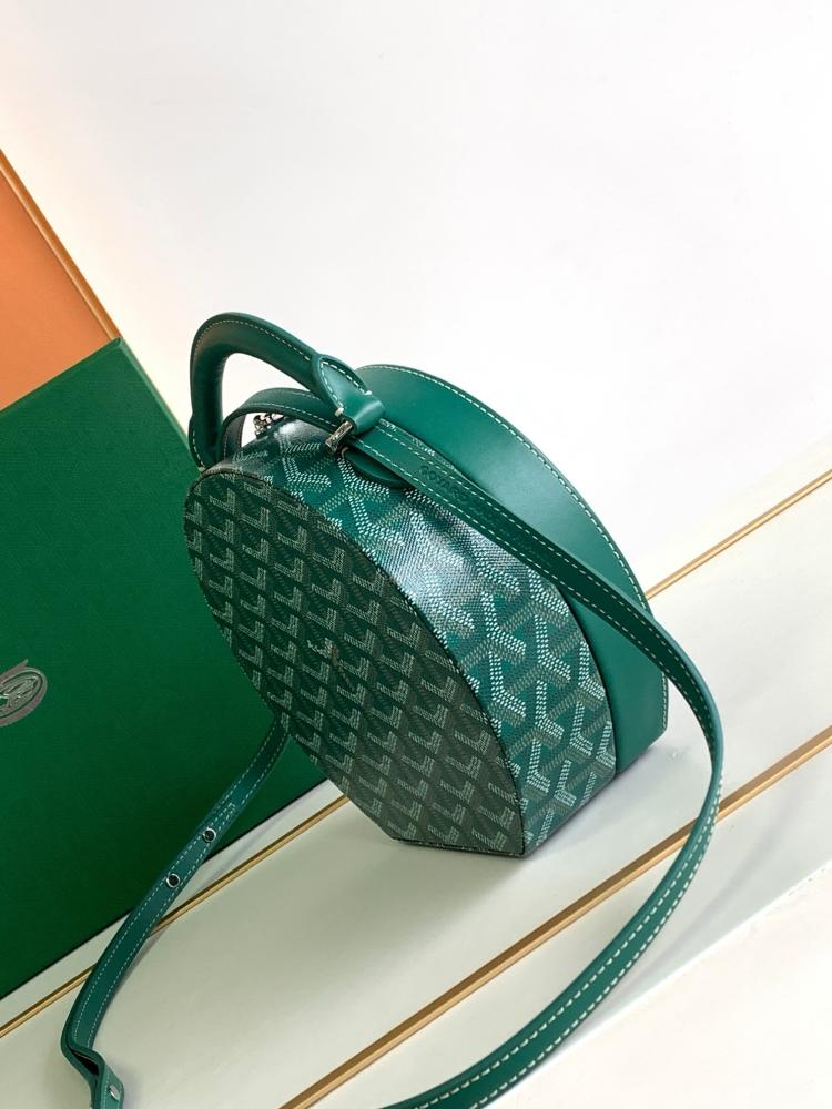 حقيبة جويارد دائرية بلون أخضر فاخر، قطعة مستوحاة من صناديق السفر القديمة بتصميم عصري أنيق. بلمستها الدائرية الجريئة، تقدم لك Goyard تجربة فاخرة تمزج بين التراث والموضة الحديثة. مثالية للمناسبات الخاصة أو لتكملي بها إطلالتك اليومية برقي.