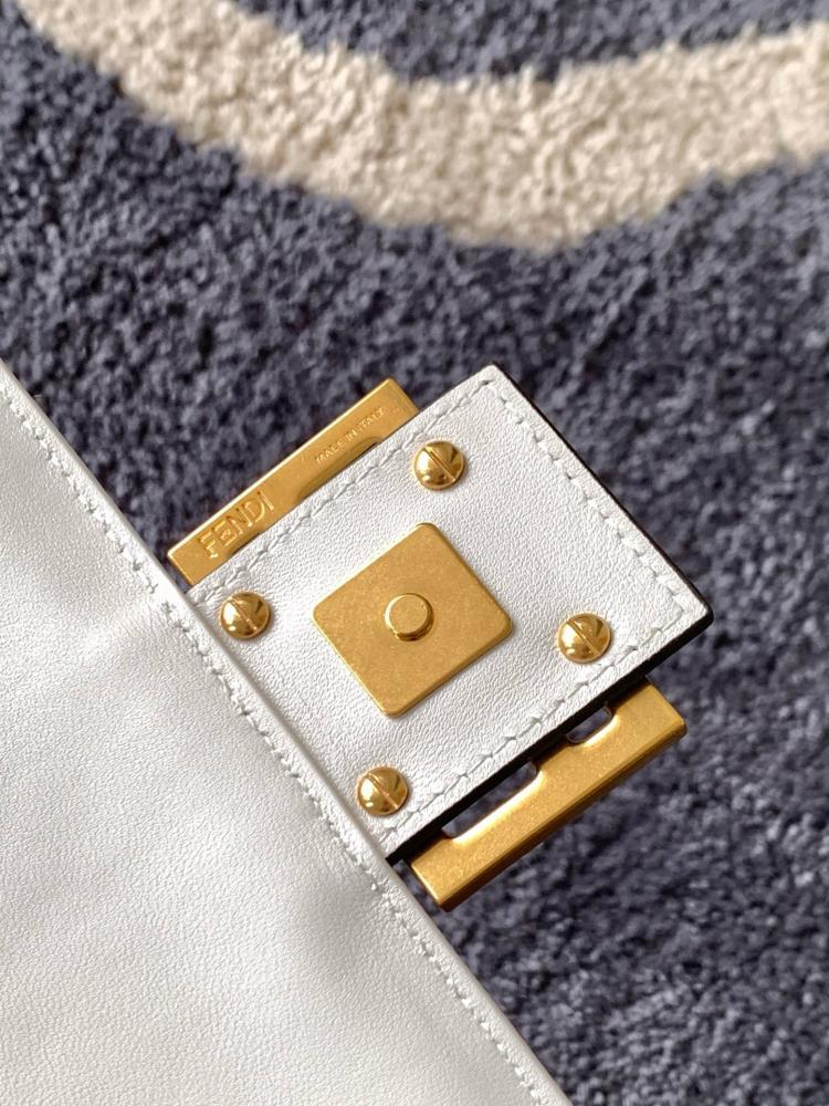Carry this white Fendi Mini Baguette bag and add a touch of luxury to your look. It combines elegance with a modern design. Thanks to its crisp white color and luxurious leather, this women's bag gives you an elegant, feminine touch that complements both casual and formal looks. Its practical design makes it ideal for carrying essentials with ease and style.