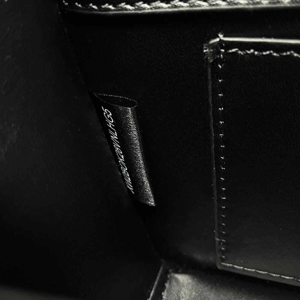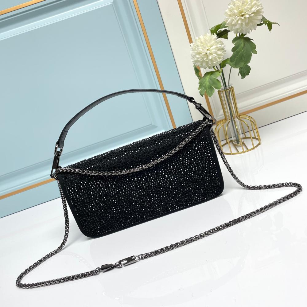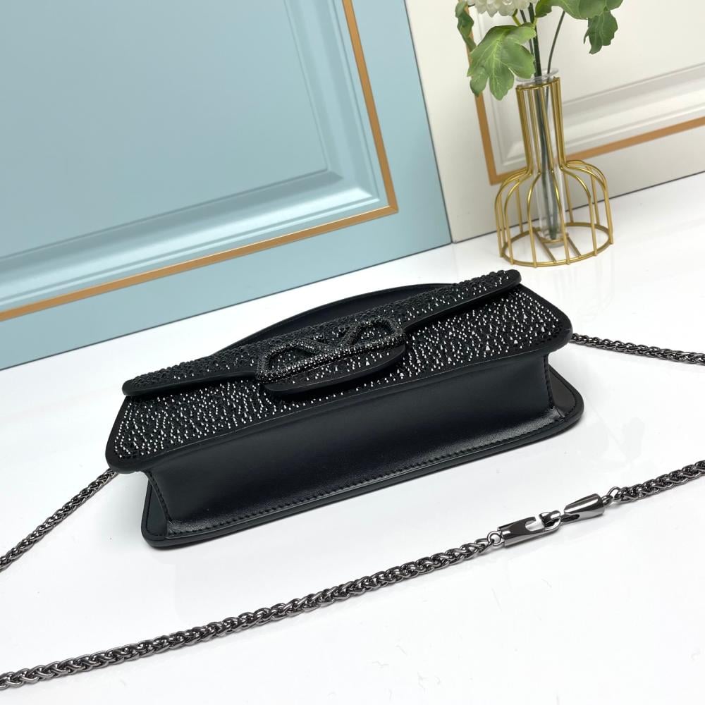 - A small black bag with elegant metal details and the prominent Valentino logo, highlighting the design and reflecting the brand's luxury.