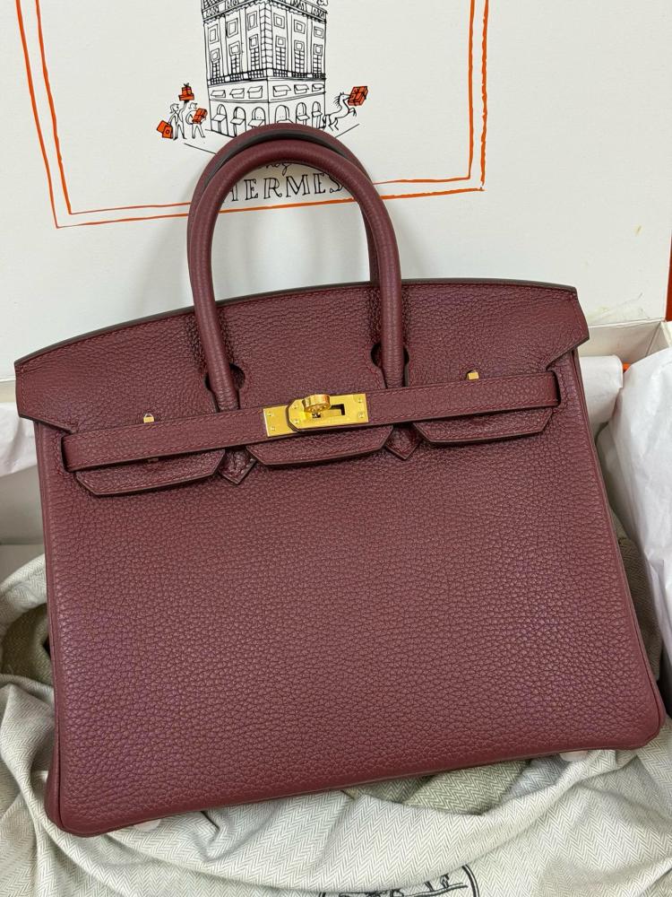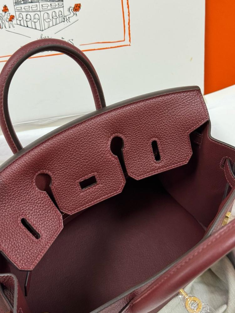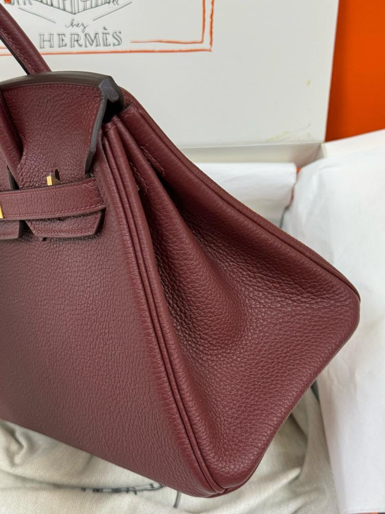 Burgundy Hermes Birkin bag with comfortable handle and gold logo